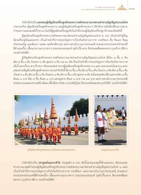 คันละ ๑ นาย ฉัตร ๕ ชั้น คันละ ๑ นาย และชุมสาย คันละ ๑ นาย รวม ๓๔ นาย แตงกายตามโบราณราชประเพณี
