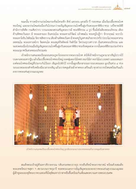 รอบเอวพระลองสําหรับคลองมือเวลายกเชิญ แลวถวายคลุมดวยผาตาดทอง เสร็จแลว คุกเขาถวายบังคมพรอมกันแลว