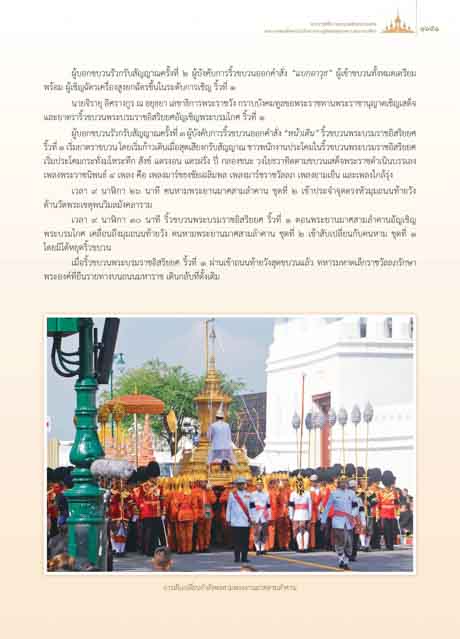 ผูบอกขบวนรัวกรับสัญญาณครั้งที่ ๓ ผูบังคับการริ้วขบวนออกคําสั่ง “หนาเดิน” ริ้วขบวนพระบรมราชอิสริยยศ