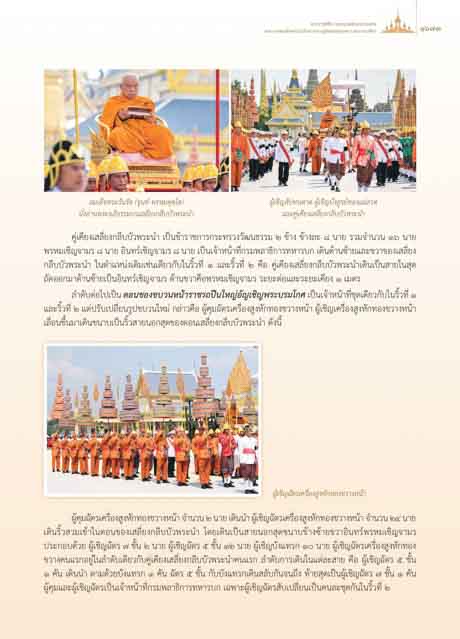 ผูคุมฉัตรเครื่องสูงหักทองขวางหนา จํานวน ๒ นาย เดินนํา ผูเชิญฉัตรเครื่องสูงหักทองขวางหนา จํานวน ๒๔ นาย