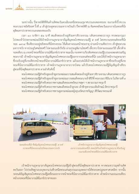 จากพระที่นั่งทรงธรรมไปยังพระบรมมหาราชวัง ออกจากรถยนตพระที่นั่ง สงตอใหกับเจาพนักงานภูษามาลาที่รอรับอยู