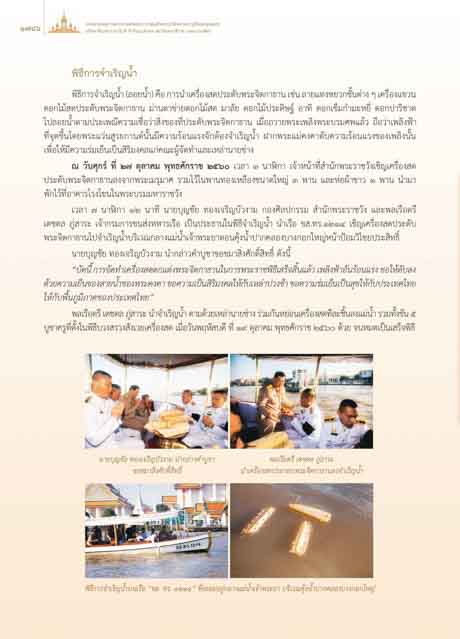 พิธีการจําเริญนํ้าบนเรือ “ขส. ทร. ๑๒๑๔” ซึ่งลอยอยูกลางแมนํ้าเจาพระยา บริเวณคุงนํ้าปากคลองบางกอกใหญ