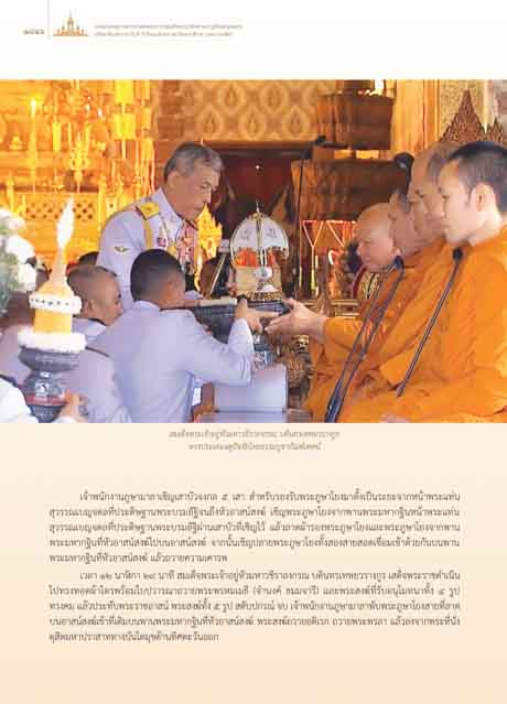 ทรงคม แลวประทับพระราชอาสน พระสงฆทั้ง ๕ รูป สดับปกรณ จบ เจาพนักงานภูษามาลาพับพระภูษาโยงสายที่ลาด
