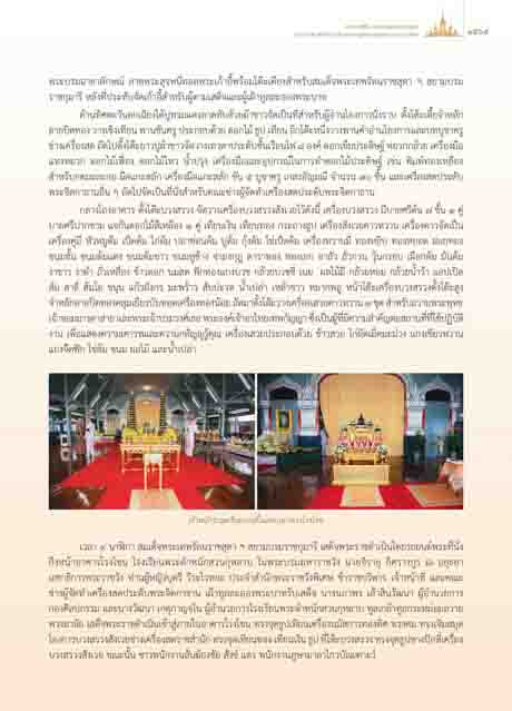 จําหลักลายปดทองคลุมเยียรบับทอดเครื่องทองนอย ถัดมาตั้งโตะวางเครื่องเสวยคาวหวาน ๓ ชุด สําหรับถวายพระพุทธ